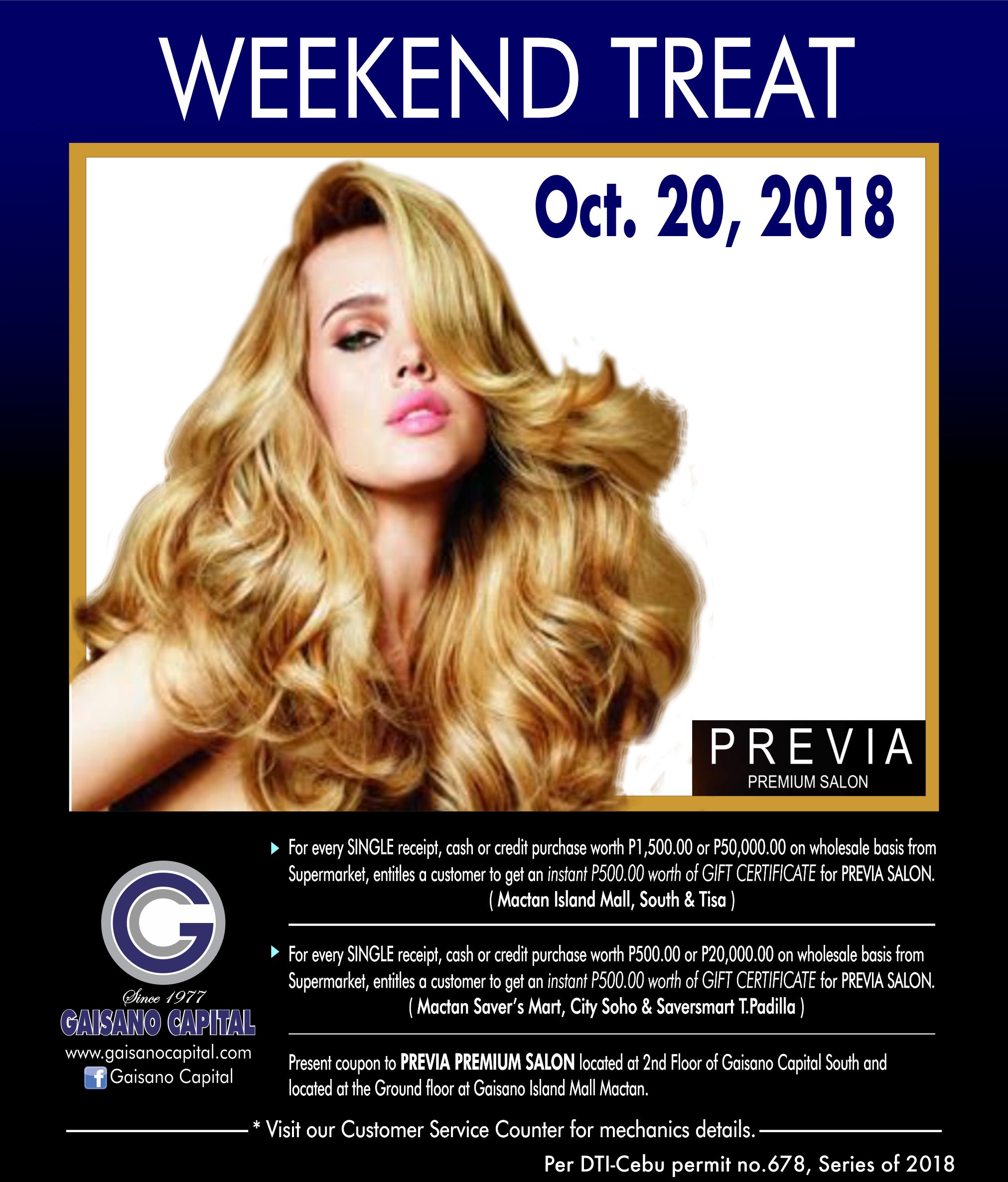 1. a. For every SINGLE RECEIPT, cash or credit purchase worth Php 1,500.00 or Php 50,000.00 on wholesale basis from Supermarket, entitles a customer to get an instant P500.00 worth of Gift Certificate from PREVIA PREMIUM SALON (Gaisano Capital South, Gaisano Mactan Island Mall & Gaisano Capital Tisa branch only).