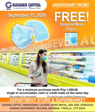 For a minimum purchase worth Php 3000.00 siglr, cash or credit made on the same day ( September 15, 2020 ). Department Store & Supermarket