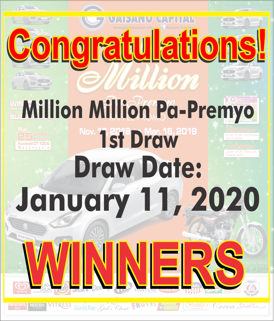 Congratulations to all the winners of our 1st Draw last January 11, 2020 for our “Million Million Pa-Premyo Raffle Promo.” More prizes is up for grabs during our 2nd and grand draw! Shop now at your nearest Gaisano Capital store. Buy more and spend less only at Gaisano Capital.