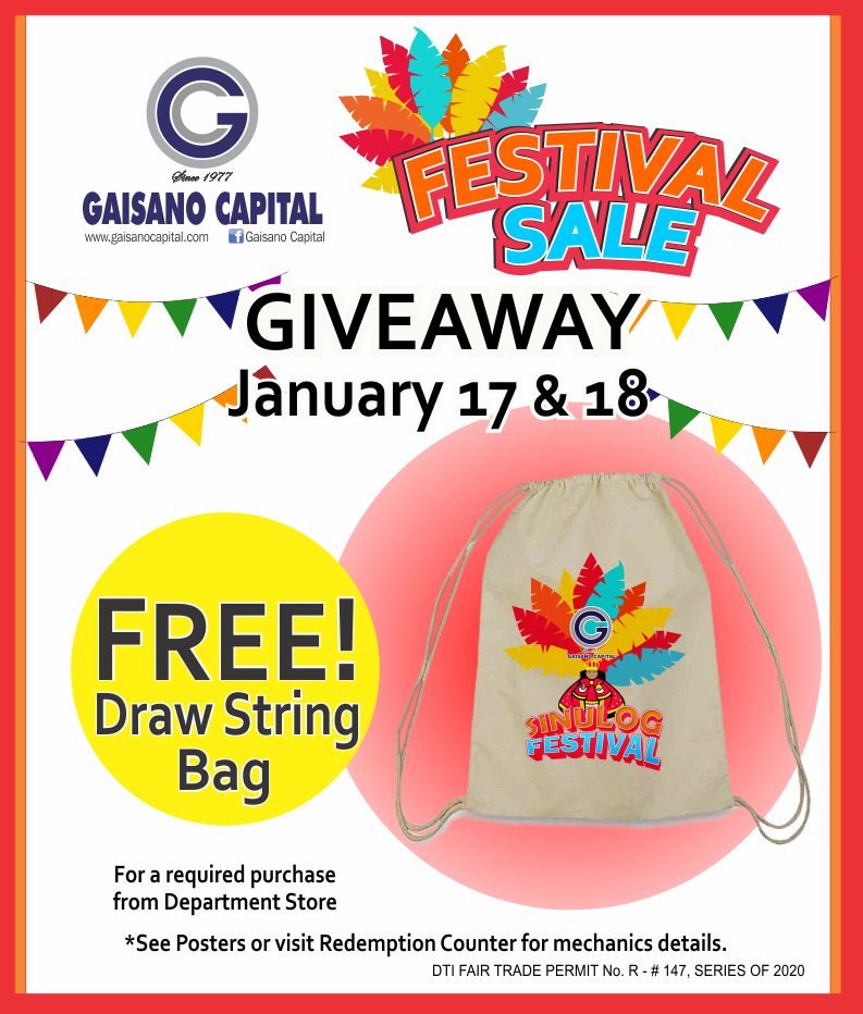 Shop during our Festival Sale on January 17-19 and get this festive Drawstring bag for FREE with a minimum purchase of P1,000 from our Department Store. Visit the nearest Gaisano Capital participating stores: