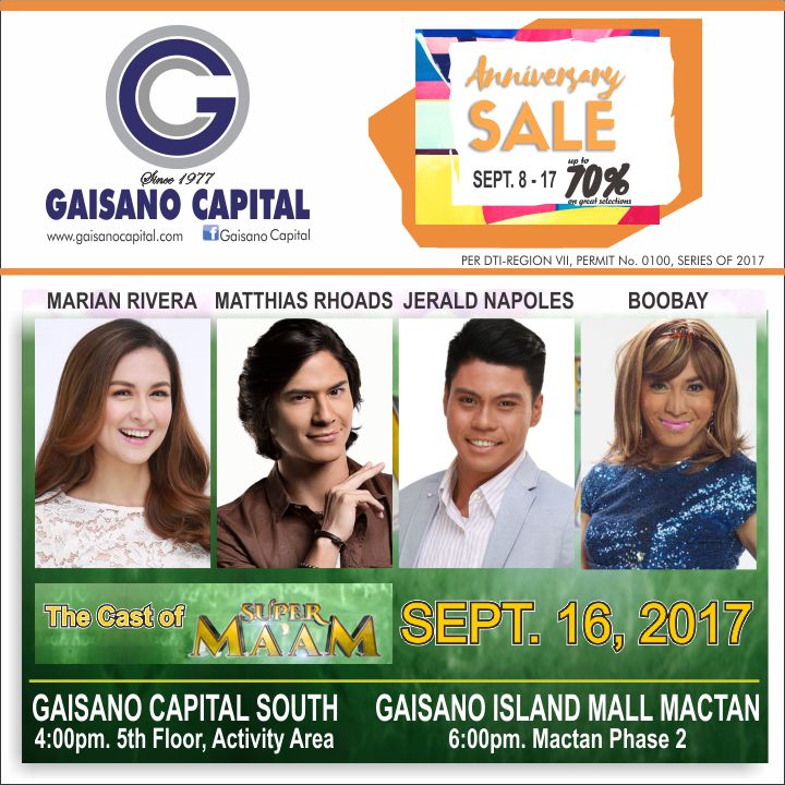 Join our celebration together with the casts of the newest GMA TV series “Super Ma’am” MARIAN RIVERA, MATTHIAS RHOADS, JERALD NAPOLES & BOOBAY this September 16 (Saturday) at Gaisano Capital South (4pm) and at Gaisano Island Mall Mactan (6pm). See you there!