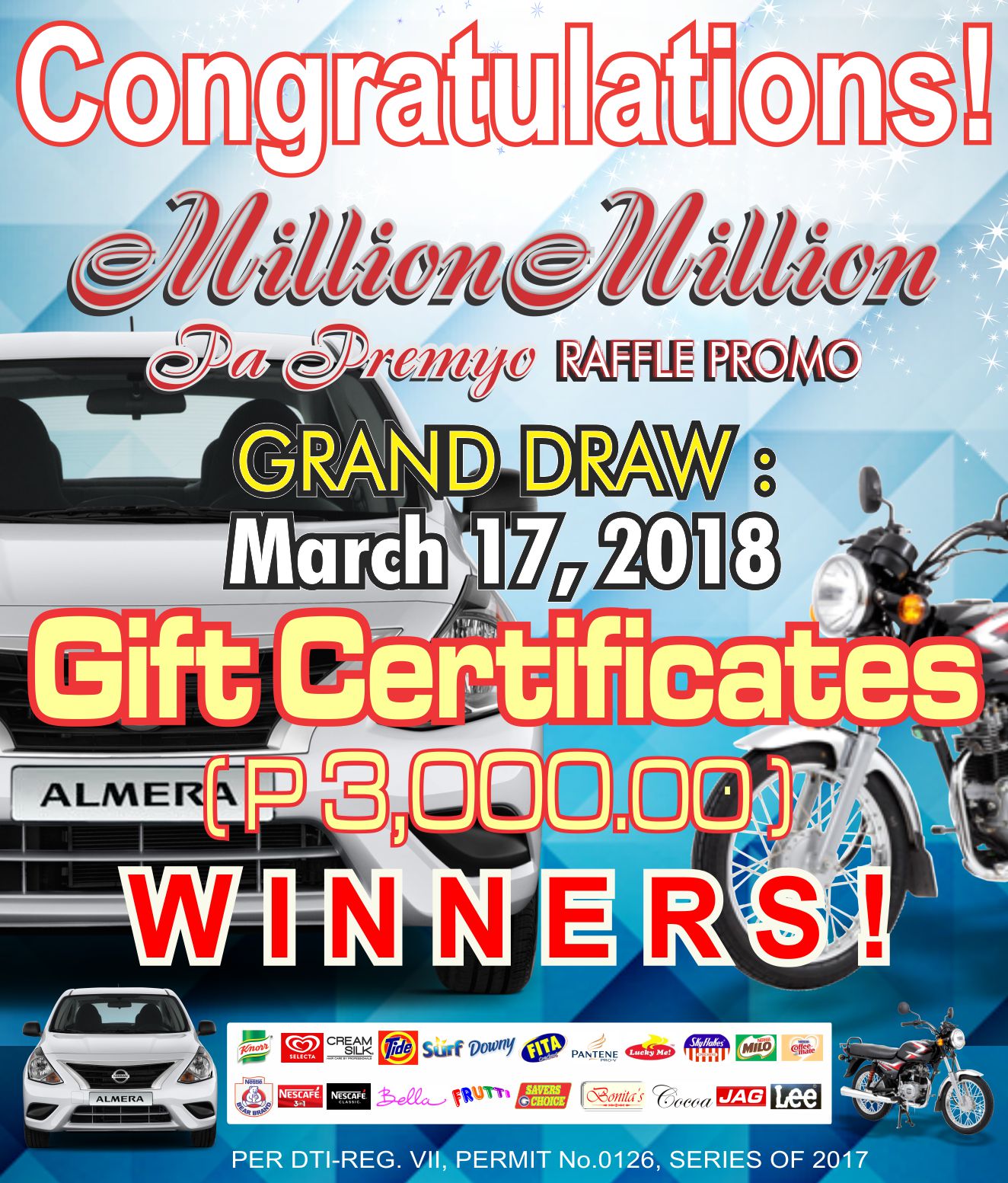WINNERS OF GIFT CERTIFICATE WORTH 3,000.00