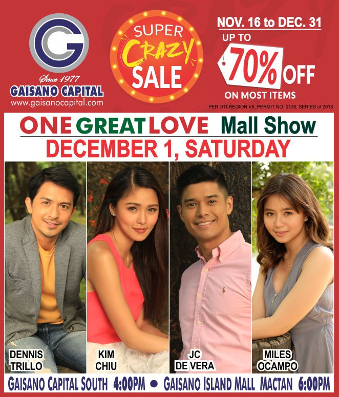 Gaisano Capital brings you the casts of the movie “ONE GREAT LOVE” (an official entry of MMFF) : DENNIS TRILLO, KIM CHIU, JC DE VERA & MILES OCAMPO on December 1, 2018.