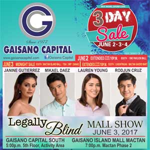 It’s our 3 DAY SALE starting June 2 to June 4. Enjoy BIG discounts of up to 50% on wide selection of items. Plus! Watch the cast of GMA TV drama series “Legally Blind” live at Gaisano Capital South (5 PM) and at Gaisano Island Mall Mactan (7 PM) on June 3, 2017. See you all there!