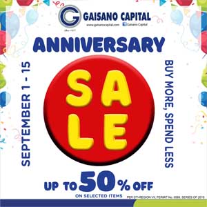 It’s time for a Celebration! Shop during our Anniversary Sale from September 1-15 and get up to 50% discount on great selection of items. Plus! Special promotions awaits to you our valued shoppers! Visit the nearest Gaisano Capital store in your area.