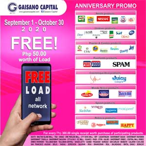Free 50.00 worth of Load to all network, for every Php 300.00 single receipt worth purchase of participating products. Visit the nearest Gaisano Capital store in your area.Buy More and Spend Less only at Gaisano Capital.#FreeLoadPromo#GaisanoCapital