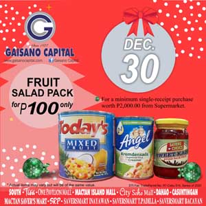 For a minimum single-receipt purchase worth P2,000.00 from Supermarket. Limit to 1 Free Gift per customer only PARTICIPATING STORES Gaisano Capital Casuntingan, Gaisano Capital Danao, Gaisano Capital South, Gaisano Capital Tisa, City Soho Mall, Gaisano Capital SRP, One Pavilion Mall, SaversMart Bacayan, SaversMart Basak, SaversMart Inayawan, SaversMart T.Padilla