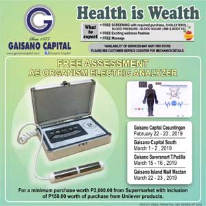Join our Health & Wellness Raffle Promo from February 15 to March 30 and win exciting fitness equipment , accessories and wellness products (grocery pack). Plus a FREE massage and FREE screening (cholesterol, BP, Sugar) at selected Cebu branches.