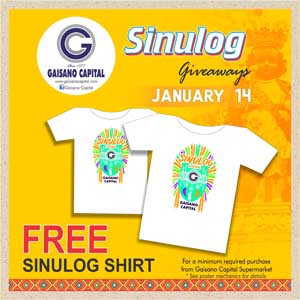 T SHIRT. Get this Sinulog T-Shirt FREE for a minimum required purchase. P1,500 worth of purchase from the supermarket for Gaisano Island Mall Mactan, South, Tisa, Danao, OPM & SRP branch. P1,000 worth of purchase from the supermarket for Basak Savers Mart, City Soho Mall, Casuntingan, T. Padilla, Inayawan & Bacayan branch.