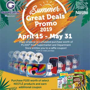 It’s an exciting summer as we bring you our SUMMER GREAT DEALS PROMO 2019. Just shop at Gaisano Capital stores nationwide and win exciting prizes such as Gift Certificates, home and kitchen appliances. Get a raffle coupon when you purchase worth P1,000 from our Supermarket or Department store. Earm additional coupon when you purchase select NESTLE products.**